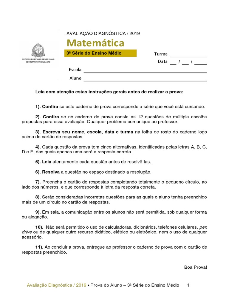 (PDF) 3ª série do Ensino Médio Matemática · 3ª série do Ensino Médio Matemática Questão 1 1