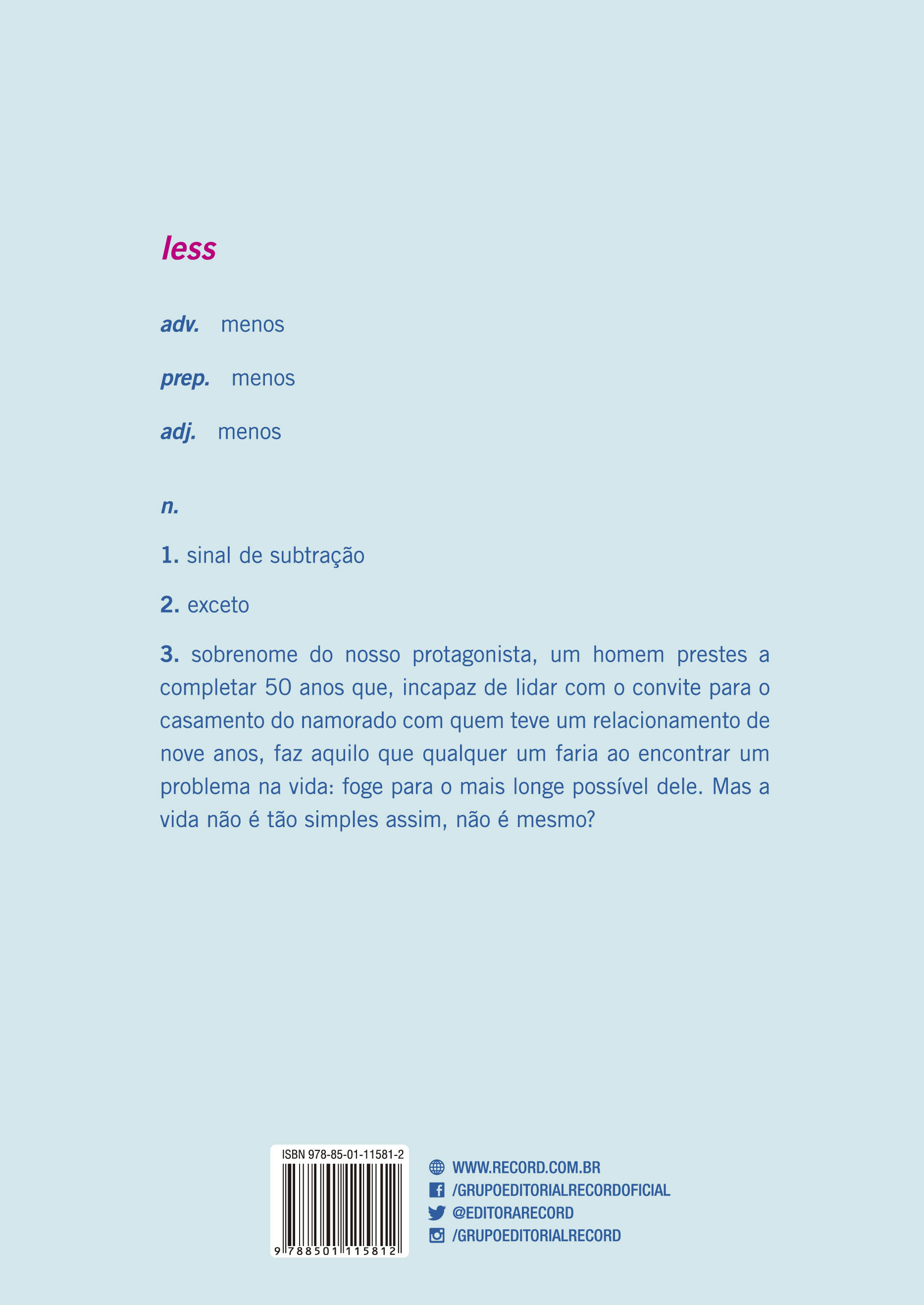 Uma divertida sátira da vida no livro vencedor do Pulitzer de ficção de 2018. Arthur Less é um escritor medíocre prestes a completar 50 anos. Certo dia, recebe um convite de casamento: o homem com quem teve um relacionamento não tão sério assim no.