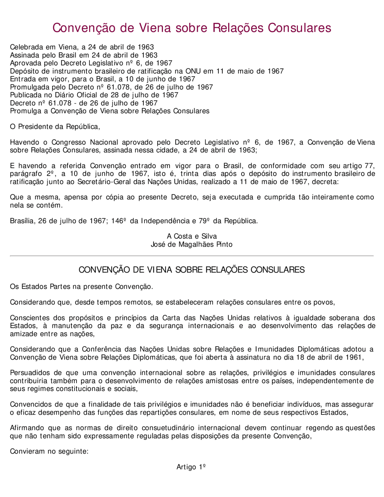 Havendo o Congresso Nacional aprovado pelo Decreto Legislativo nº 103, de 1964, a Convenção de Viena sobre Relações Diplomáticas, assinada a 18 de abril de 1961; E havendo a referida Convenção entrado em vigor para o Brasil, de acordo com seu artigo 51,