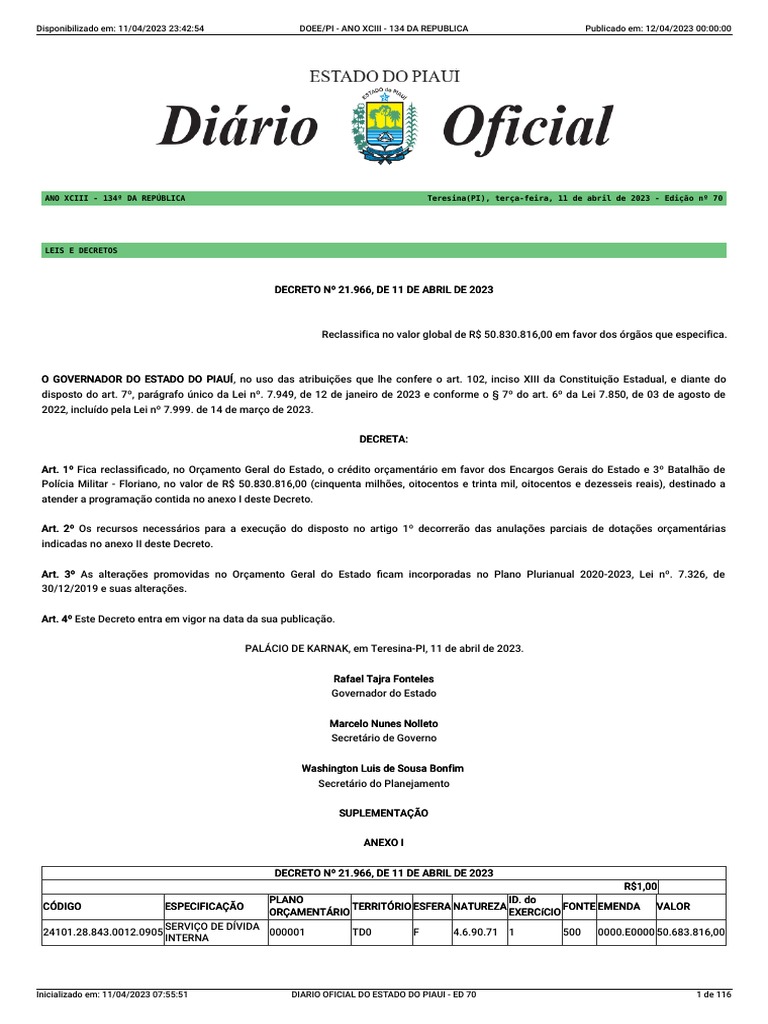 Diario Oficial Do Estado Do Piaui Publicacao N 70 PDF Orçamento governamental Orçamento
