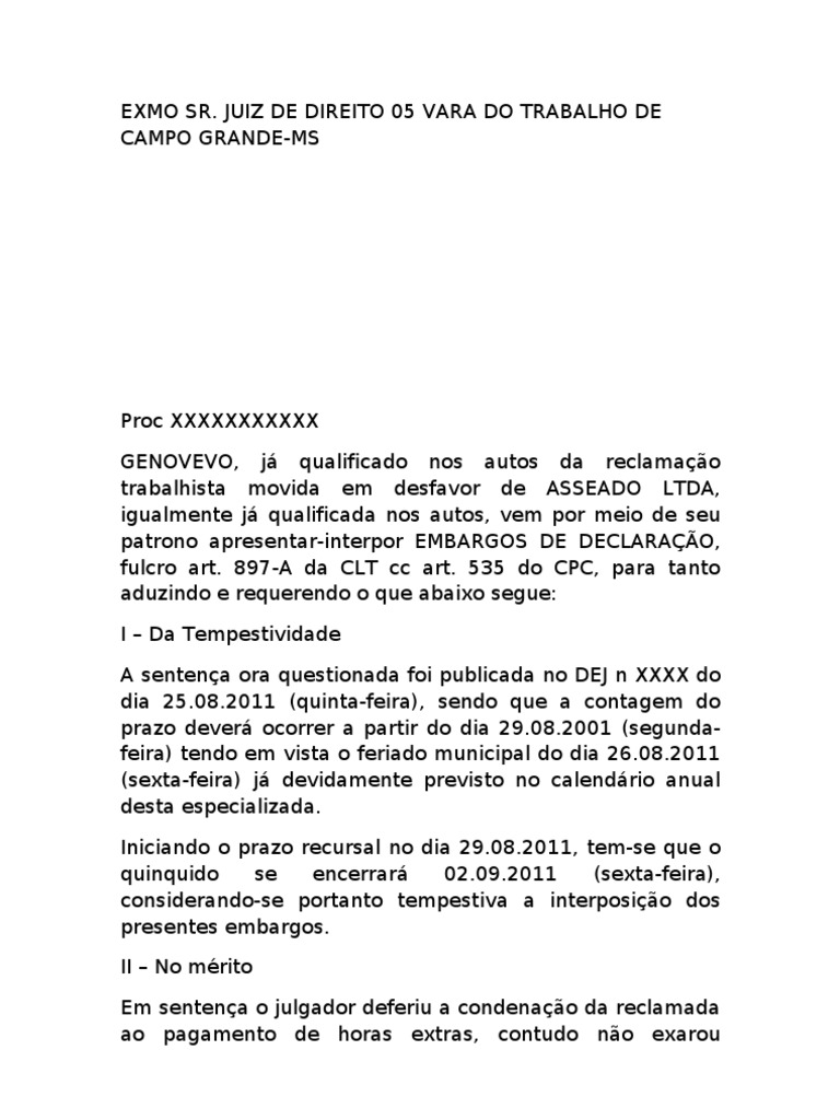 Modelo de Embargos de Declaração PDF Sentença (jurídico) Hora extra