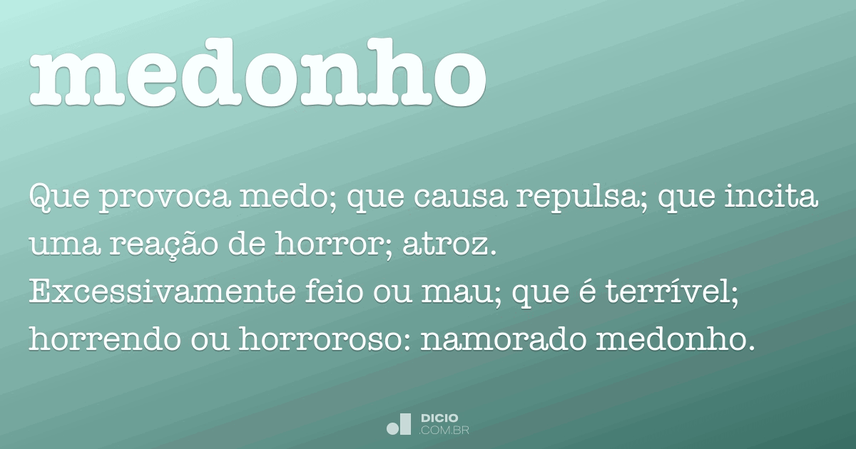 Significado de Medonho no Dicio, Dicionário Online de Português. O que é medonho: adj. Que provoca medo; que causa repulsa; que incita uma reação de horror; atroz. Excessivamente feio ou mau; que é terrível; horrendo ou horroroso: namorado medonho. Que se deve abominar; odioso: assassinato.