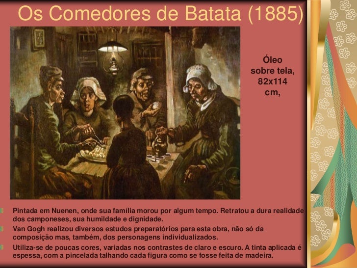 Uma das mais eloquentes obras de Vincent van Gogh (1853-1890) é " Os comedores de batatas ". "Os Comedores de Batatas", de Vincent van Gogh. 1885. 82 X 114cm, ost. Este quadro pertence à primeira fase da pintura do artista, ainda desenvolvida na Holanda, sob influência do realismo do artista Jean François Millet (1814-1875), tendo.