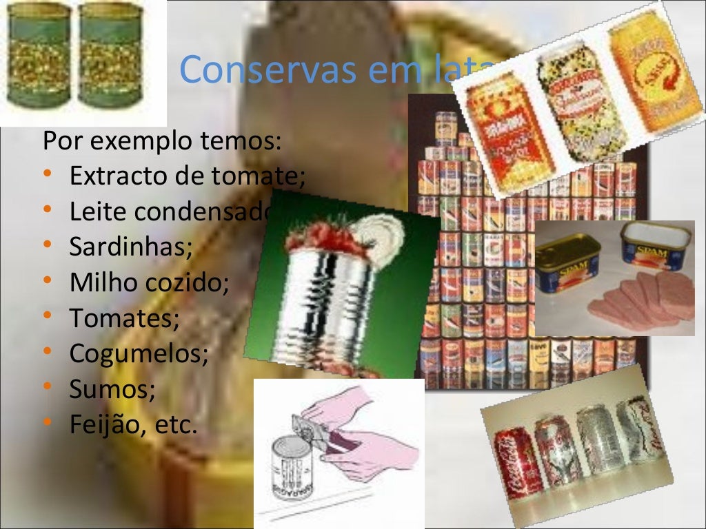 Adição de sal. A salga é um dos processos mais antigos de conservação e consiste em colocar sal no exterior do alimento, eliminando uma parte da água que se encontra no interior. O método pode ser a seco ou em forma de salmoura, isto é, água mais sal, assim como os milhos e ervilhas em conserva. Adição de açúcar.