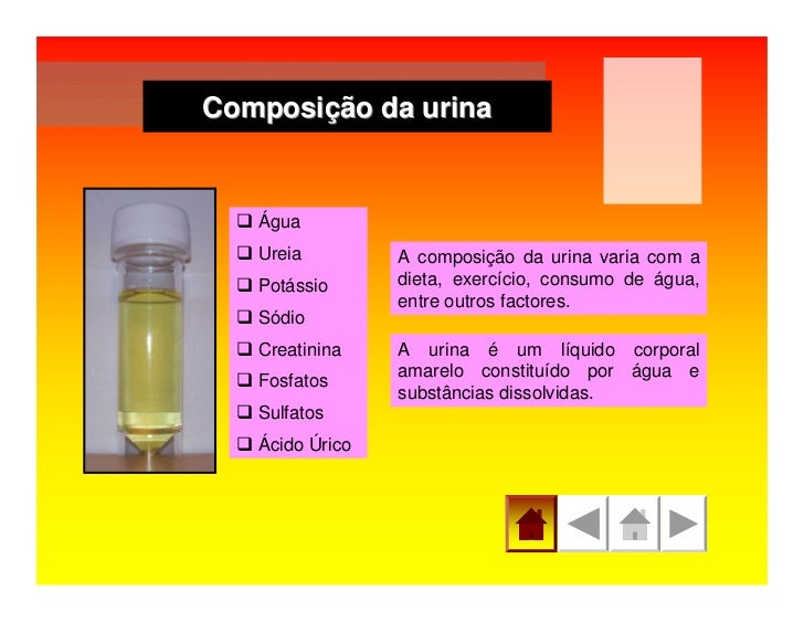 Assim como a urina de outros animais, a urina humana é composta principalmente de água (91\% a 96\%), mas contém também ureia, ácido úrico, sal e outras substâncias. A urina é o produto final, resultante da excreção renal. Quais os três componentes da urina? A urina é composta de aproximadamente 95\% de água.
