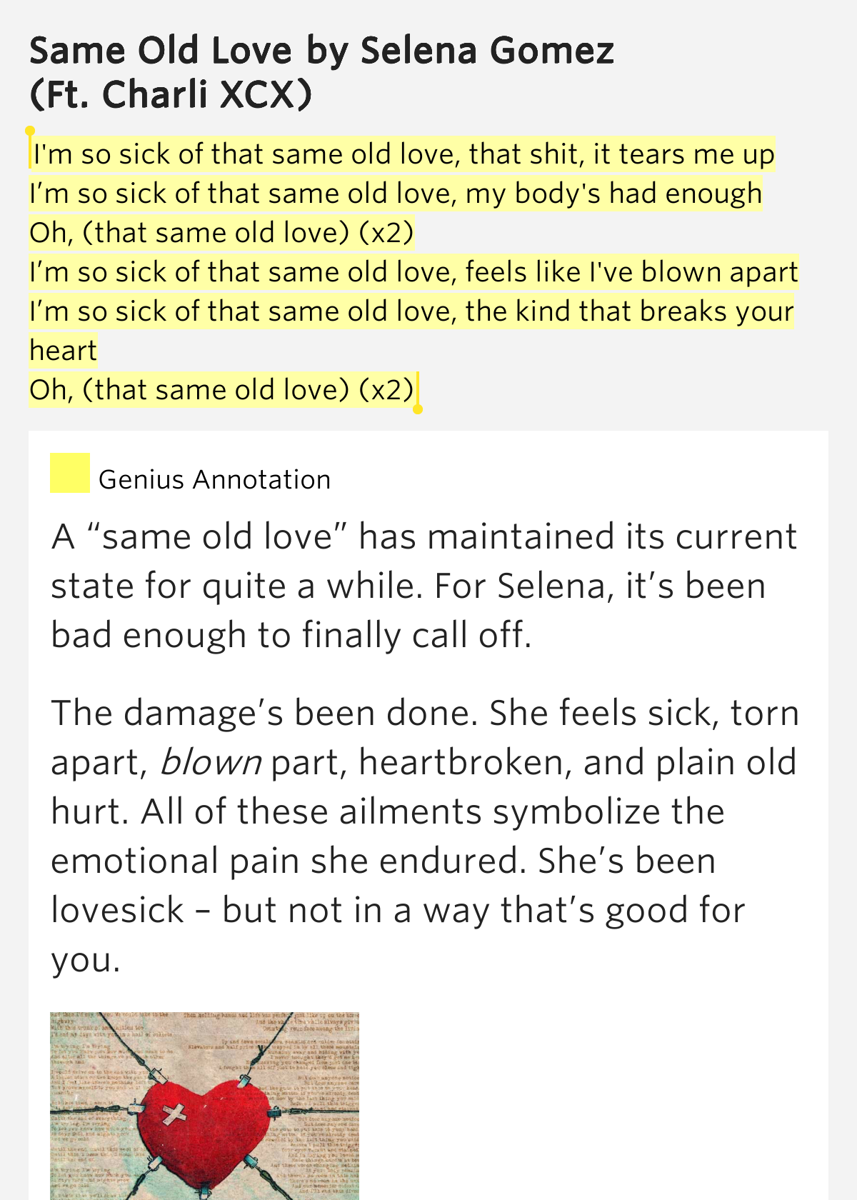 Watch on. Charli XCX wrote "Same Old Love" and her vocals are featured on the chorus. "I'm so sick of that same old love, that s--t, it tears me up / I'm so sick of that same old love, my body's.