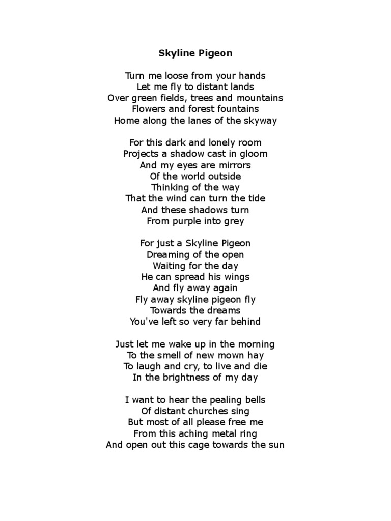Fly away, skyline pigeon, fly. Towards the dreams. You've left so very far behind. Let me wake up in the morning. To the smell of new-mown hay. To laugh and cry, to live and die. In the brightness of my day. I wanna hear the pealing bells. Of distant churches sing.
